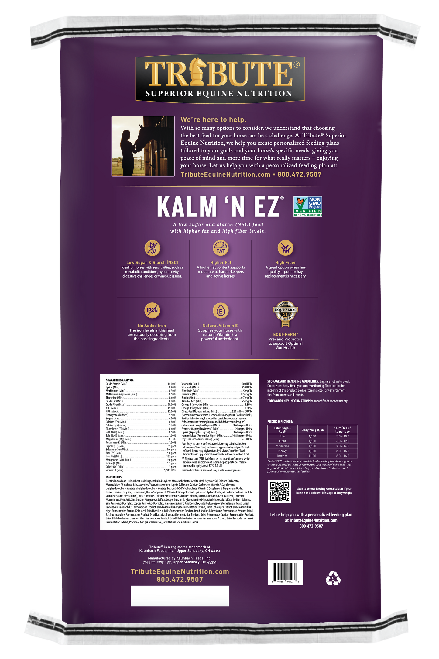 Non-GMO Kalm ‘N EZ® Pellet is higher in fat (8%), high in fiber (20%), very low in NSC (13.5%) and does not have any added iron. This Non-GMO Project Verified feed is suitable for moderate to harder-keeping horses with sugar and starch sensitivities, including Insulin Resistance, PSSM Type 1 and other metabolic disorders. The low sugar and starch (NSC) levels also make it an excellent choice for hyperactive horses and horses with digestive tract sensitivities. Its high fiber level also makes Kalm ‘N EZ® Pellet a great option when hay quality is poor or hay replacement is necessary. This feed is formulated with pre- and probiotics to support your horse’s digestive health.