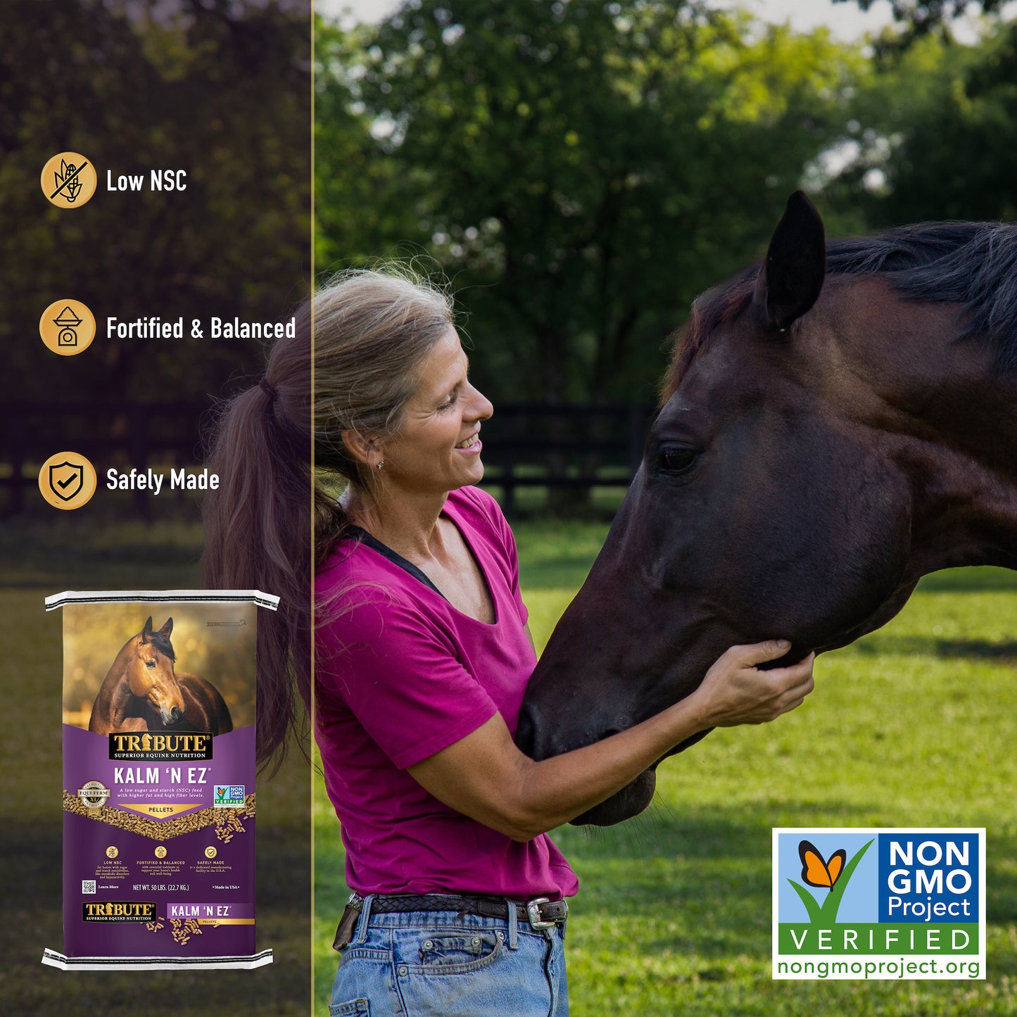 A Non-GMO Project Verified, low sugar and starch (NSC), pelleted horse feed for all classes of adult horses.